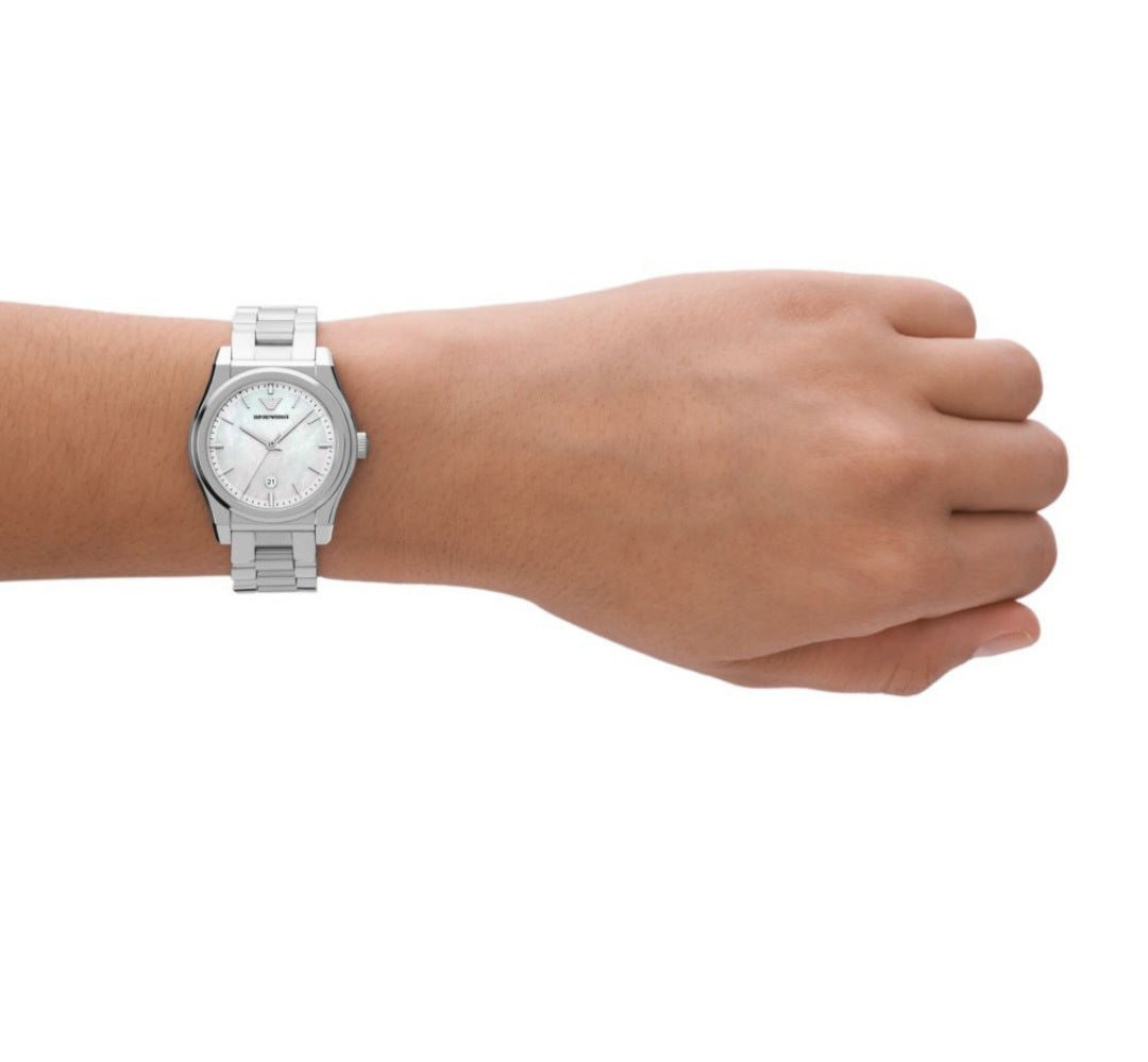 The Emporio Armani AR11557 is a stylish women's watch featuring a stainless-steel case and bracelet. Its three-hand date movement displays hours, minutes, and seconds, along with the date. With sleek design and modern aesthetic, this timepiece is perfect for everyday wear or special occasions, exuding elegance and sophistication. A chic accessory for any outfit, showcasing Italian style.