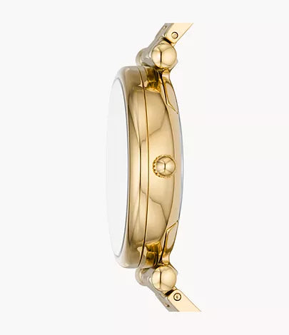 This 35mm Carlie features a white sunray dial, three-hand date movement and gold-tone stainless steel bracelet.