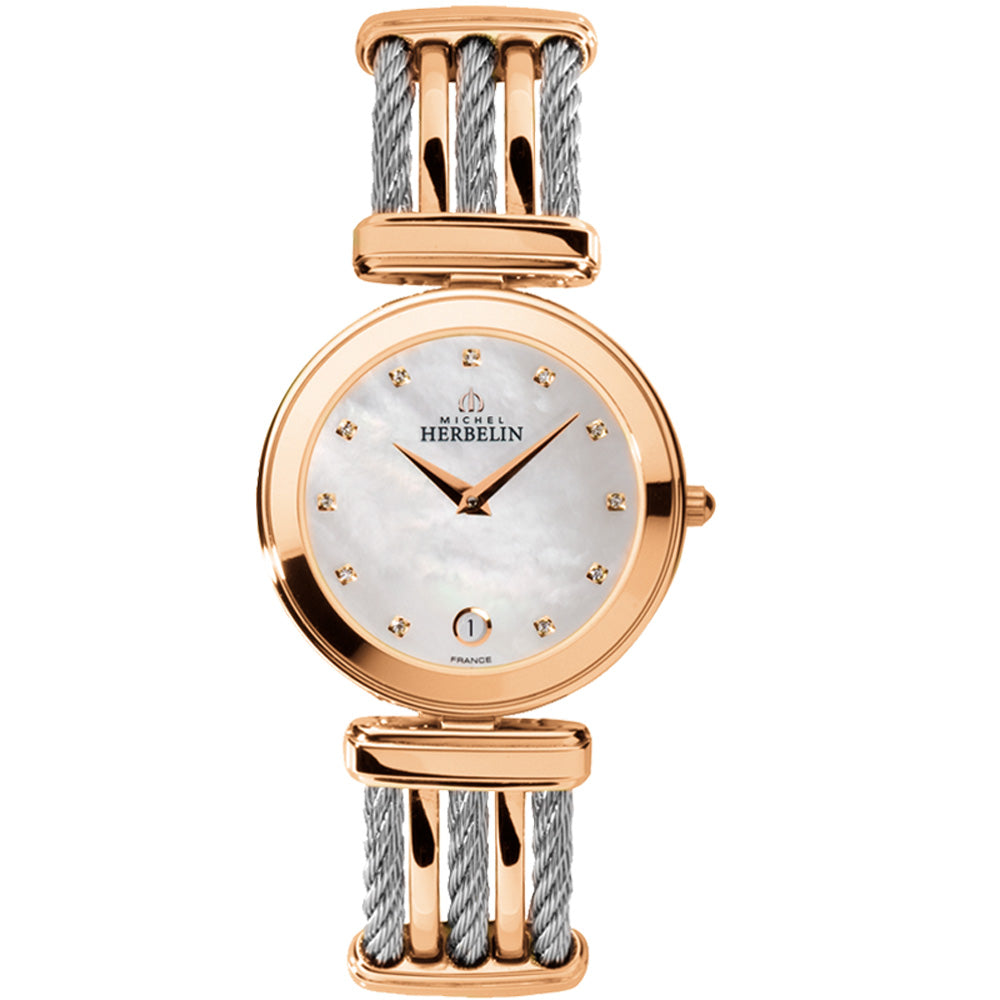 Elevate your style with the Michel Herbelin watch, a masterpiece of elegance and sophistication. The rose gold case and white mother-of-pearl dial exude luxury, while the cable-link bracelet adds a touch of modernity. Perfect for formal events or everyday wear, this timepiece is a timeless classic. Make a statement with this exquisite watch, crafted with precision and attention to detail, embodying the essence of French horlogerie.